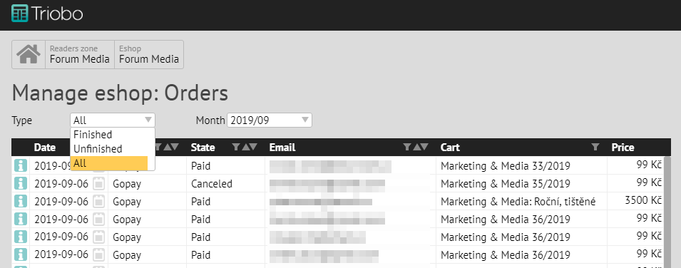K dispozici máte kompletní přehled všech objednávek, který můžete filtrovat podle stavu a měsíce.