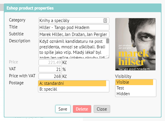 Poštovné – v závislosti na tom, jak jste si definovali kategorie poštovného při nastavení e-shopu (nelze udělat uživatelsky, musíme nastavit my) vyberete typ poštovného. Například kategorie „A“ budou knihy a kategorie „B“ zlevněné poštovné pro zaslání drobného speciálu.