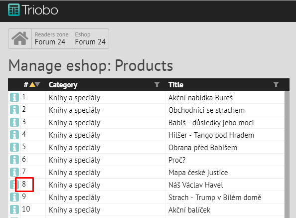 Sekce “Jak měnit pořadí produktů”Pomocí tažení myší (drag and drop) – položku zboží chytnete za číslo na začátku řádku a táhnete do požadované polohy.