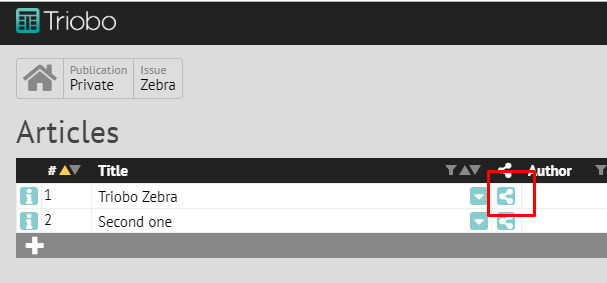 V přehledu článků kliknete na ikonku sdílení u článku, jemuž chcete nastavit vlastní parametry. Pozn.: ikonka sdílení se objeví až poté, co vydání vypublikujete do webové čtečky.