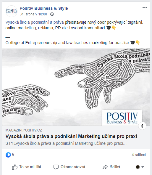 Jakmile někdo sdílí na Facebooku odkaz na některou stránku vaší publikace, objeví se webová adresa, název článku a automaticky vygenerovaný obrázek. Vypadá to nějak takto: