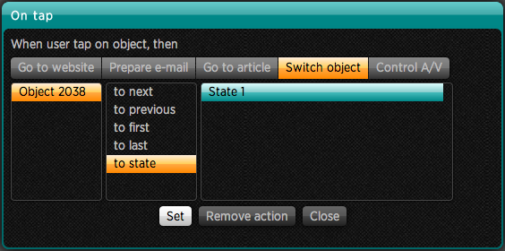 Nejdříve vytvořte variabilní objekt. Pak nakreslete první tlačítko – jako textový rámec. Nastavte akci On tap (Na dotek) jako ovládání variabilního objektu – přepnutí do stavu číslo 1.
